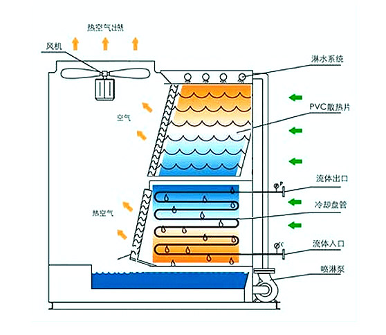 The working fluid (pure water or antifreeze) circulates in the coil of the closed cooling tower. The heat of the working fluid diffuses into the water flowing through the coil. At the same time, the air outside the unit enters from the air inlet grille on the side of the unit, which is perpendicular to the flow direction of water. It flows upward through the coil. A small part of the water evaporates and absorbs the heat. The hot and wet air is discharged into the atmosphere by the fan on the top of the cooling tower. The rest of the water falls into the bottom pan and is recycled by the pump to the water distribution system and back to the coil.